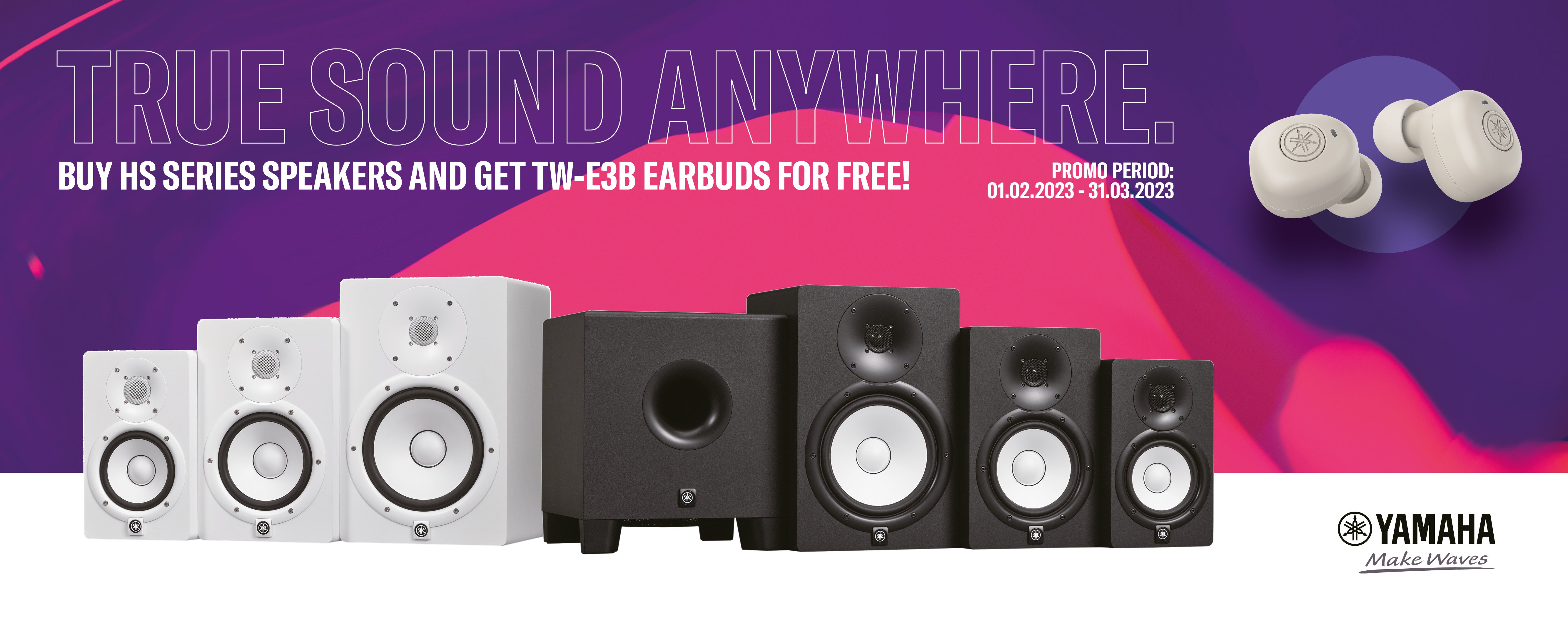 Giving the generous gift of Yamaha Sound Anywhere, when you pick up a set of Yamaha HS studio monitors any time between the 1st of February and the 31st of March, 2023, Yamaha will lob in a free set of TW-E3B earbuds!